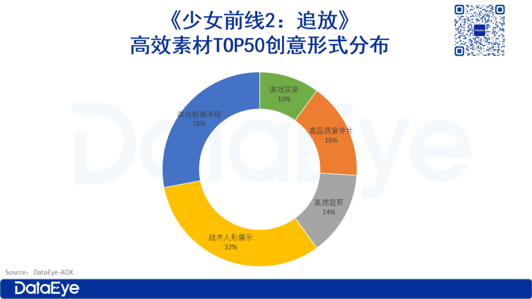 DataEye研究院整理了《少女前线2:追放》投放计划数TOP50的高效素材,其投放素材创意形式中,“战术人形展示”和“游戏剧情演绎”占比较高,二者合计占比达60%。“高品质宣传片”占比16%,“高燃混剪”和“游戏实录”占比不高,分别为14%和10%。
