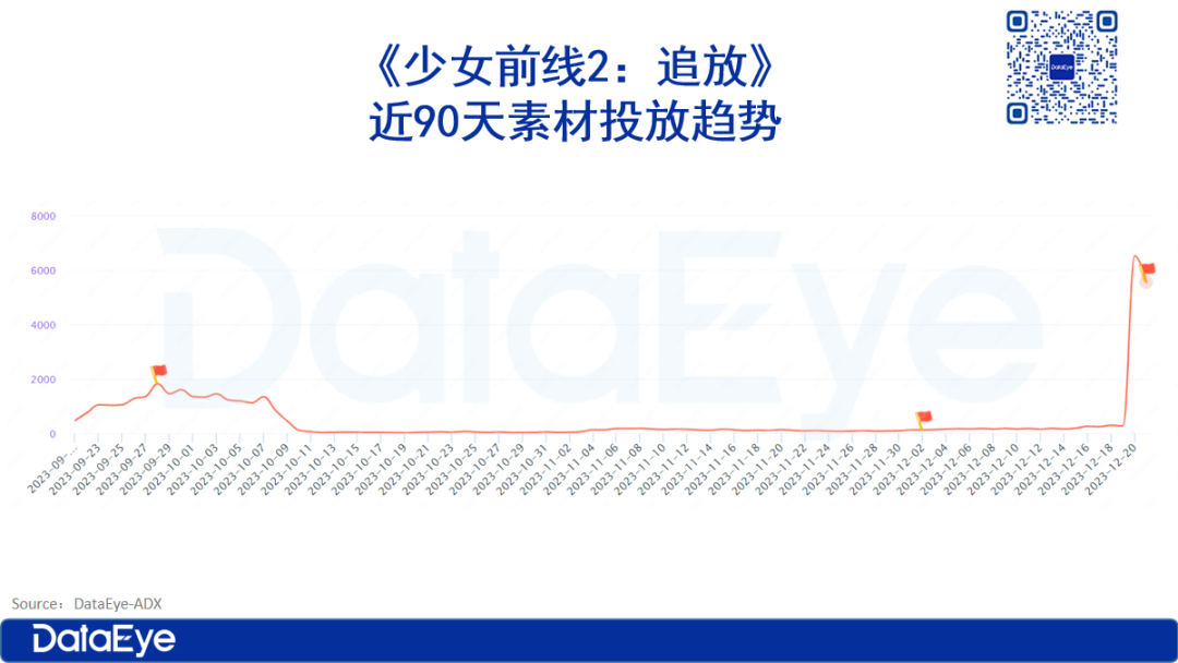 而后,日均投放都维持在100组左右。直到游戏上线爆发阶段,《少女前线2:追放》素材投放量大幅度飙升,其中上线前一天投放达6529组素材,上线当天(截至下午15点)投放超过8000组素材。