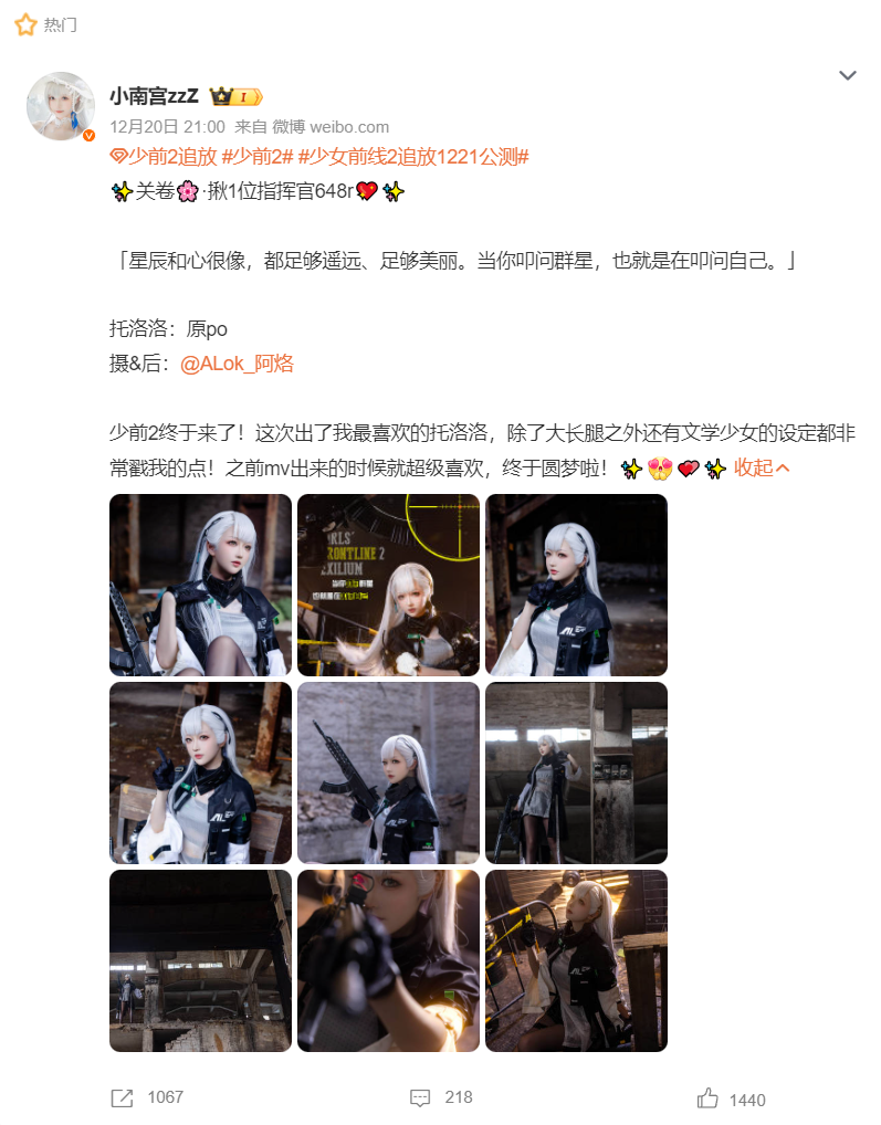 另外,DataEye研究院注意到项目组也在微博投放了#少女前线2追放1221公测#、#少前2的美术卷疯了 的话题推广热搜。并合作了少量coser,发布仿妆内容。