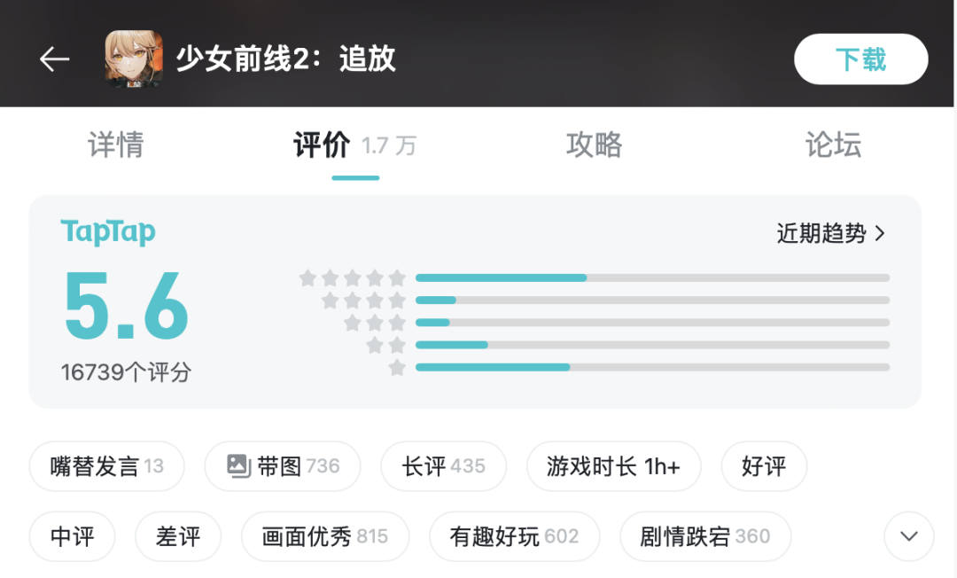 但目前游戏TapTap评分仅仅5.6分,前作则是高达8.4分,说明了两部作品在用户口碑上出现了分化。