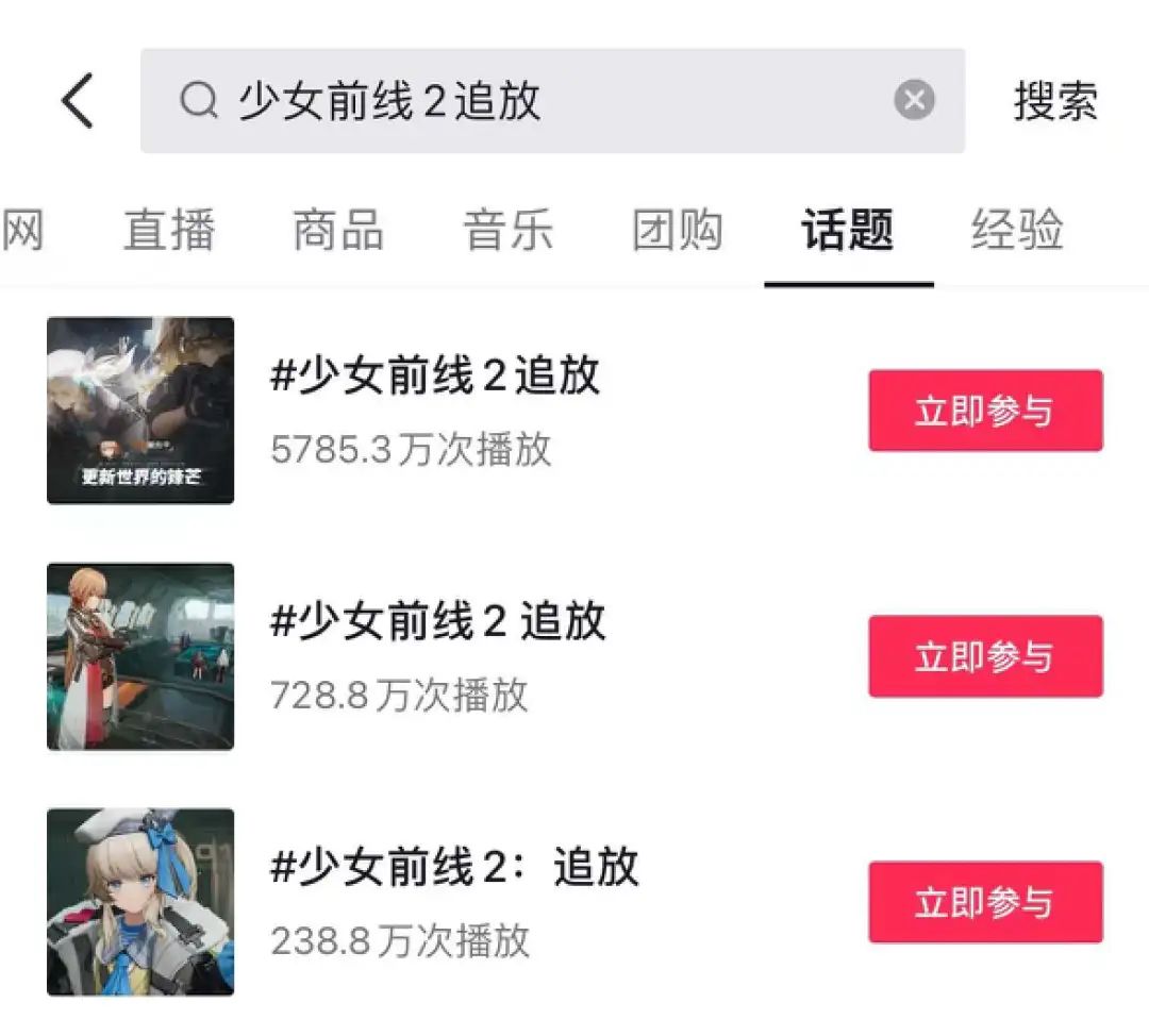 其未入驻“抖音游戏发行人计划”,也没有在话题内容上发起品牌任务(此前两款二次元战棋手游《铃兰之剑》、《钢岚》都有相关动作),但目前#少女前线2:追放 抖音话题,累积播放超过6000万。