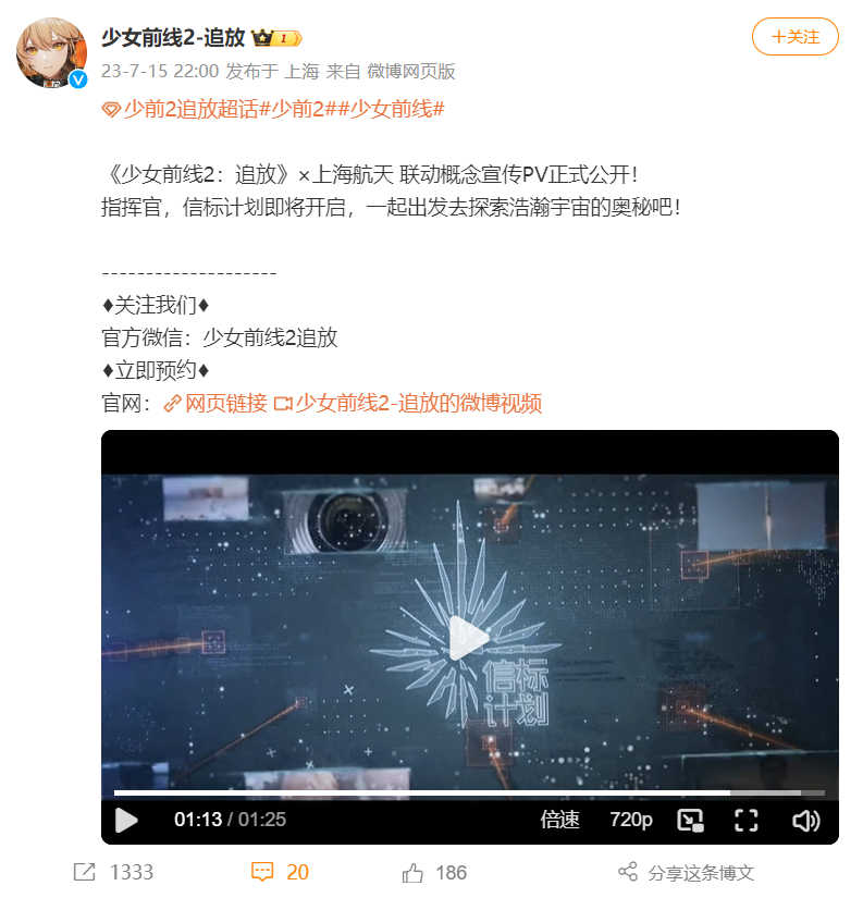 在今年5月,确认与上海航天技术研究院的联动,在7月公开首支合作PV,邀请玩家一起“探索宇宙奥秘”。2、开启二创征集活动7月、10月期间,在B站、微博开启两次同人绘图征集活动,针对火种测试、引力测试登场角色原创同人绘图作品,评选优秀作品可以获得现金+实物奖励。3、线下试玩活动