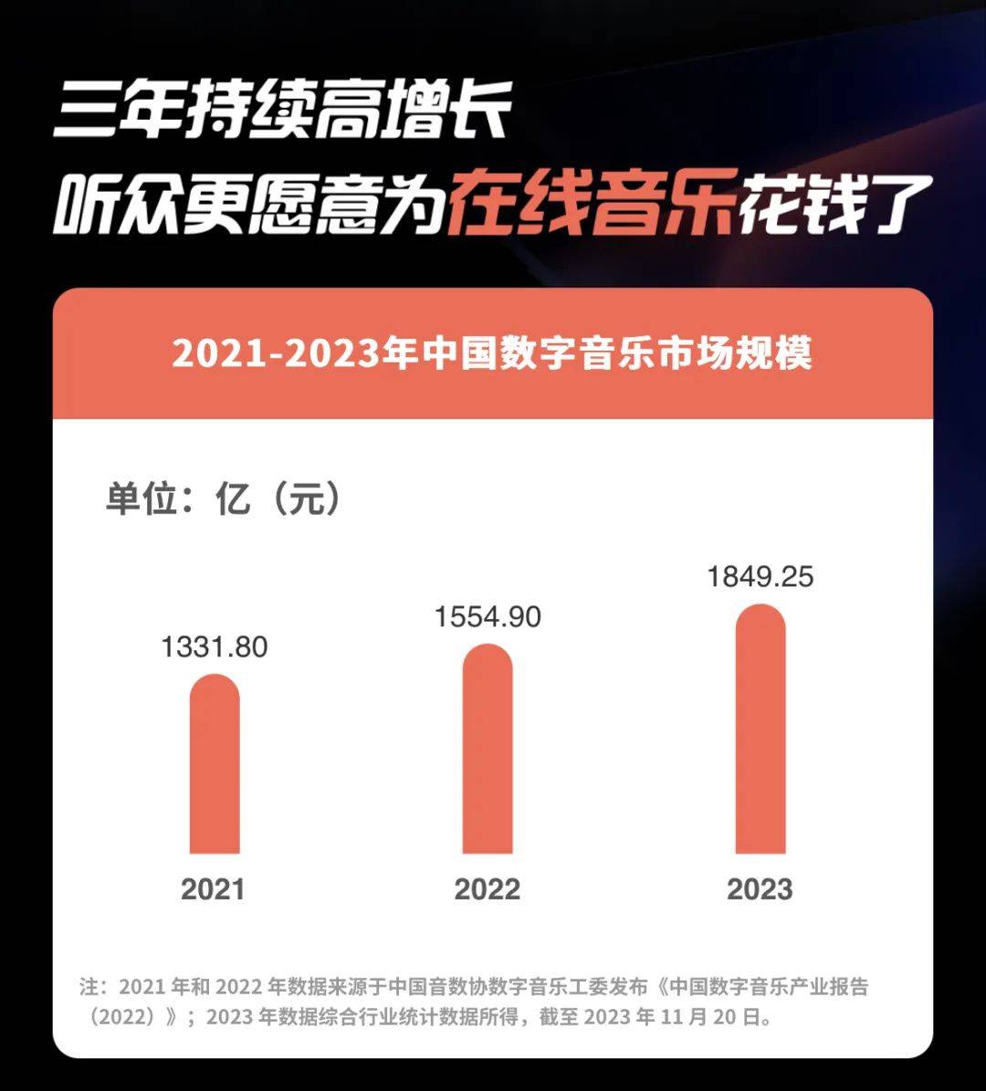 从B端产业数据来看,12021-2023年中国数字音乐市场规模逐年增长至1849.25亿元(《2023腾讯娱乐白皮书·音乐篇》数据)、2023年Q3腾讯音乐在线付费会员用户正式破亿(财报数据)、2023年1-8月“演唱会”百度搜索指数同比去年同期增长95%(《2023年线下音乐演出经济发展及线上社交内容动态洞察》数据)…… 这些喜闻乐见的“数字”令行业内外颇为振奋。