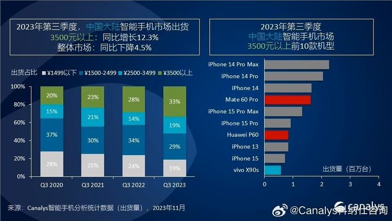 根据Canalys数据,截至2023年11月,在整体手机市场同比下降4.5%的情况下,中国高端智能手机(3500元以上)市场却逆势增长,销量同比增长了12.3%。而在刚刚过去的第三季度,高端手机占市场总销量的比例已达33%。也就是说每卖出3台手机,就有一台价格超过3500元。