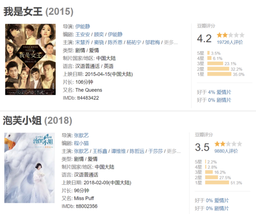 但大多数转型导演拍了一两部就放弃了。一方面,2018年之后影视热钱退潮,资本也不愿冒险,曾经“流量+IP”的路径不再奏效。另一方面,不少演员转型的导演作品面临票房口碑双失利,比如伊能静的《我是女王》、张歆艺的《泡芙小姐》票房均不到2000万,成本都没收回,豆瓣仅三四分。