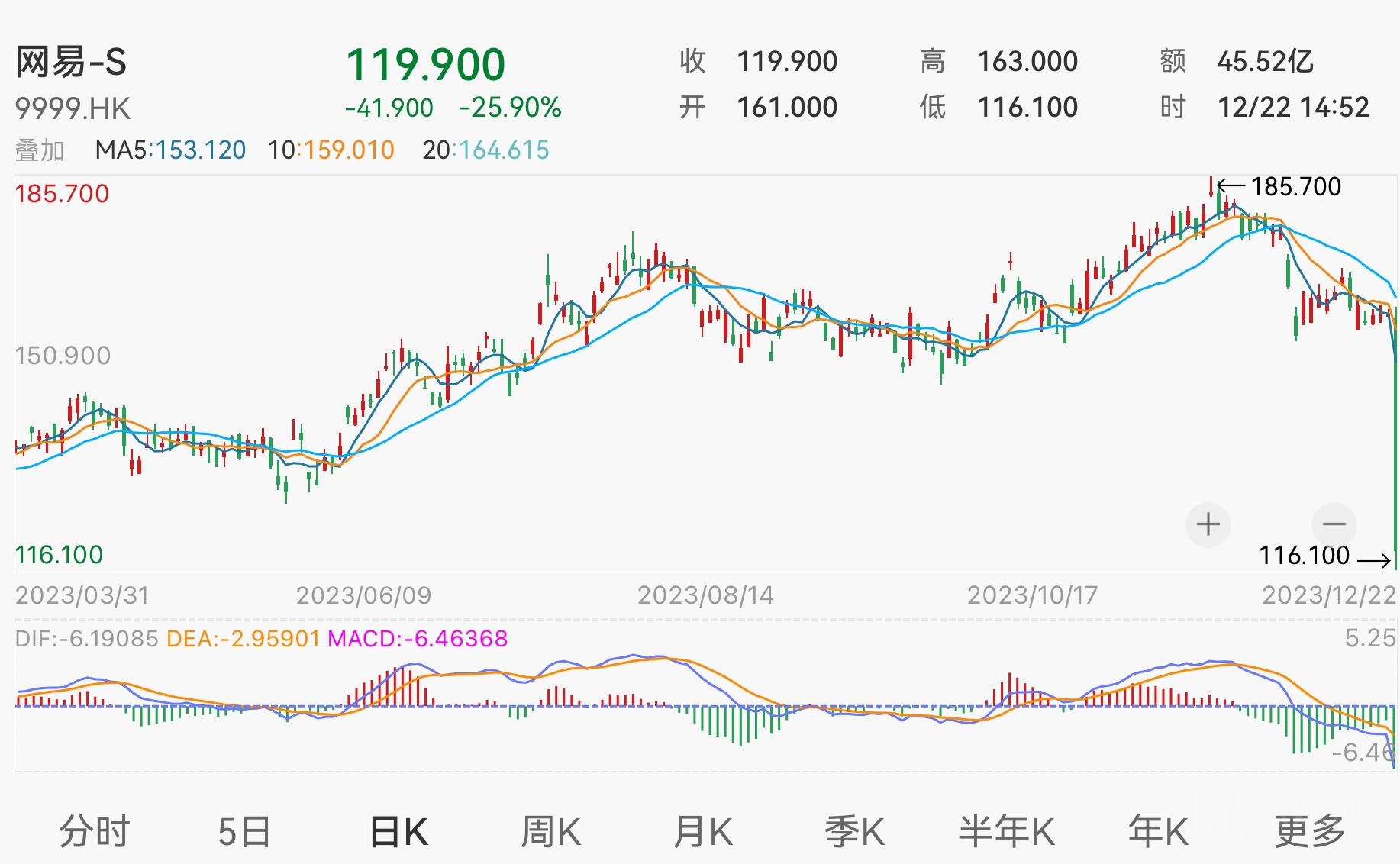 12月22日午后,港股游戏股遭重挫,尤以网易-S(09999.HK)跌幅最甚,盘中一度大跌超27%,创下自今年1月4日以来的股价新低,为116.1港元。