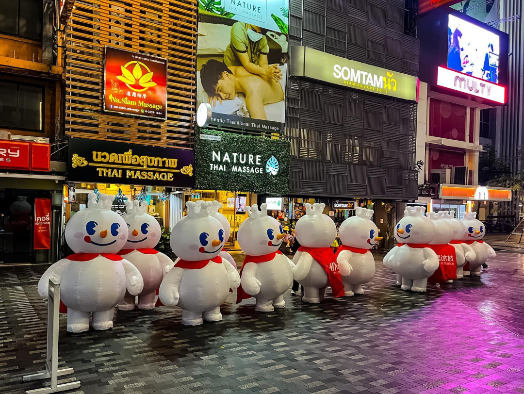 而线下运营中,蜜雪冰城不仅会结合当地文化,对店面设计、卡通形象、产品口味等进行本土化修改泰国的雪王头戴皇冠、佩戴金银珠宝,仿照当地的服饰风格。且几乎每次在新的地区开店,蜜雪冰城都会发布当地语言版本的主题曲,以更好地契合当地氛围。