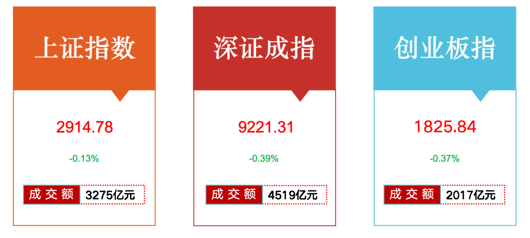 今日收盘,沪指报2914.78点,跌0.13%;深成指报9221.31点,跌0.39%;创业板指报1825.84点,跌0.37%。两市成交额7794亿元,较上一交易日放量470亿元,超4000只个股下跌。今日,北上资金净流出13.20亿元、净卖出25.11亿元,其中沪股通净流入1.20亿元、净卖出4.29亿元;深股通净流出14.40亿元、净卖出20.82亿元。
