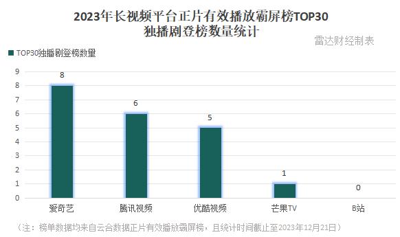 相比爱腾优三巨头,芒果TV仅有1部独播剧入围TOP30榜单。不过,芒果TV在综艺市场上的战绩却十分突出。而较晚发力自制影视综艺内容的B站,今年的战绩则颇为惨淡。