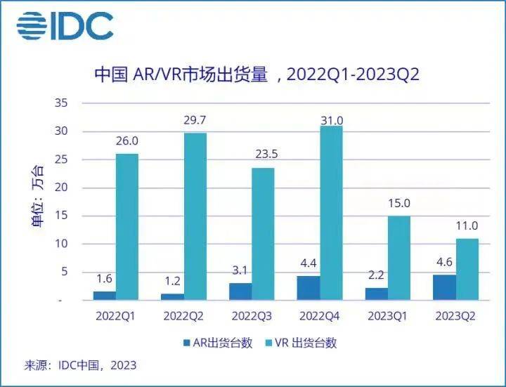 而在国内,IDC数据显示,2023年上半年AR出货6.8万台,同比上涨142%,VR出货26万台,同比下滑53.3%。