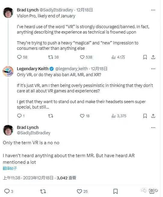 12月18日,国外XR硬件博主Brad Lynch发布推文,透露苹果在 Vision Pro 头显的岗前培训中,禁止员工使用“VR(虚拟显示)”词汇,并补充苹果公司仅禁用VR,并不禁止使用AR(增强现实)和XR(扩展现实),没有提及MR(混合现实)。