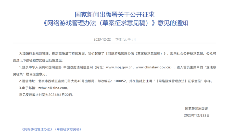 不过昨天国家新闻出版署网站公布的《网络游戏管理办法(草案征求意见稿)》(以下简称《办法》)让游戏行业又感受到一丝寒意。