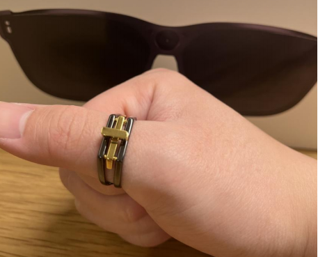 为了配合眼镜使用,官方还推出了交互外设「魔戒」,由戒指托和戒指「宝石」组合而成。戒指的面板仅有2个按键,大的叫“A键”,功能包括滑动、双触、单击;小的叫“Home”键,支持点按和长按。使用交互戒指时,将其安装到戒托上佩戴在中指进行使用即可。不过这种安装方式似乎并不牢固,总感觉下一秒就要从手上掉落,但戒指托似乎还挺好看的,单独佩戴也不缺乏时尚感。