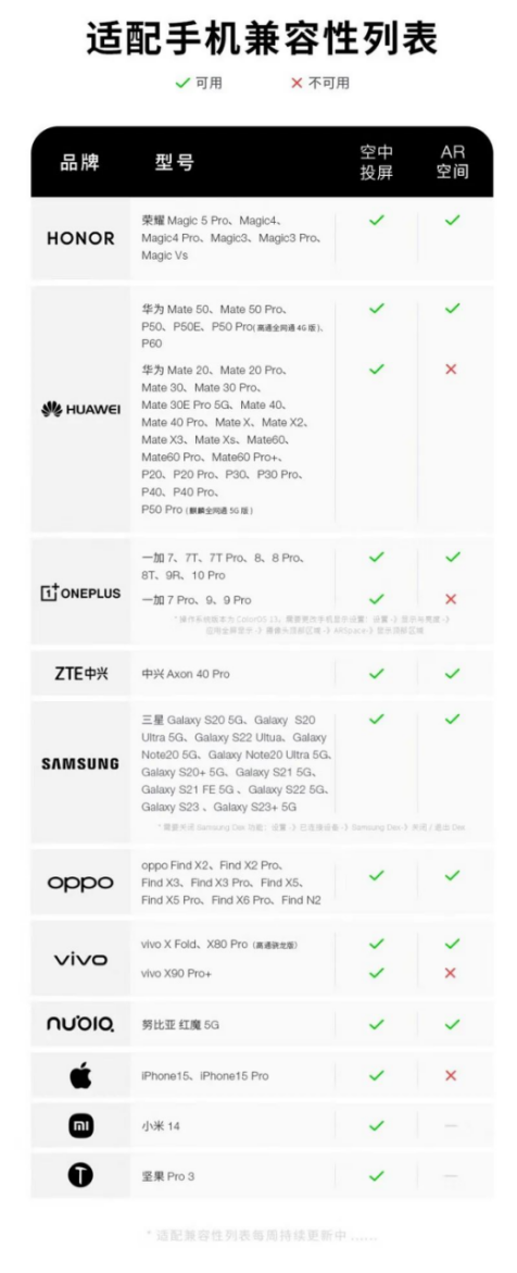 6. 适配机型:具体适配机型详见下图,但值得单独谈一谈的是ARKnovv A1的投屏功能也需要机型适配,否则无法使用,例如苹果系列的投屏功能只有iPhone15系列支持。另外不愧是曾经的锤子合伙人研发的,该设备还支持坚果pro3的使用。建议大家购买前进行参考和咨询,如果设备的适配度不完全的话会出现许多问题,例如连接不稳定、屏幕疯狂旋转、功能无法使用等一系列问题。