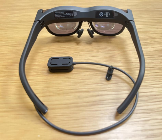发热量较大的零部件均从眼镜主体分离,设计在了与眼镜腿相连的部件上,该部件模块还可以实现一键息屏/点亮功能,且不会造成面部的热感。连接线的材质十分柔软,还配备了线夹,可以随固定到衣领上,不过由于与眼镜是一体式连接,间接牺牲了眼镜拿取和佩戴的便捷性。鼻托处使用了硅胶空气鼻托,能够增加接触面积、缓解鼻梁处的压力,同时这一部分也可以插入单独配制的近视镜片。
