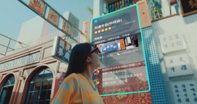 另一个功能则是AI旅游助手,可以直接通过语音询问精灵球一个问题,例如“前方有什么好吃的”,精灵球就会进行相应的搜索,并将搜索结果直观的呈现在眼前,包含了店名、营业时间、联系电话、综合评分和人均消费信息,十分便捷易用。例如看向餐厅时,眼睛中可以显示餐厅评价、招牌菜等信息;旅游时看向景点,眼前将出现景点的介绍、历史典故信息等,能够让我们快速获得信息。