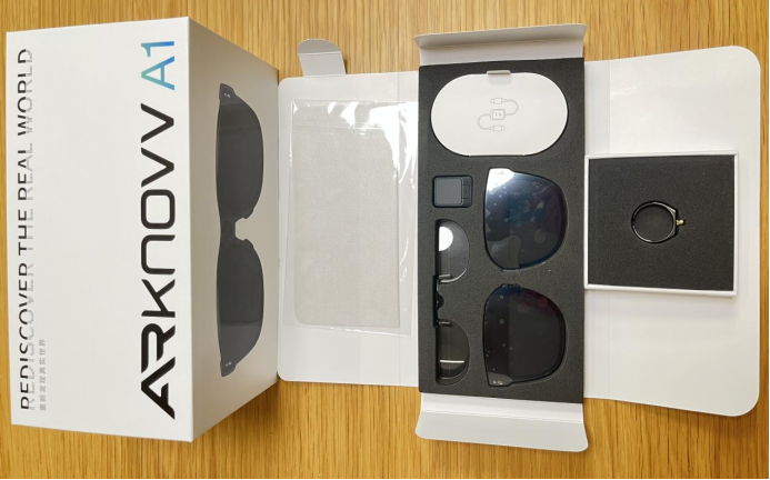 除了眼镜本体和交互戒指外,还有其它一些配件:墨镜镜片、电致变色镜片、用于为戒指充电的数据线、眼镜布、说明书及保修卡。