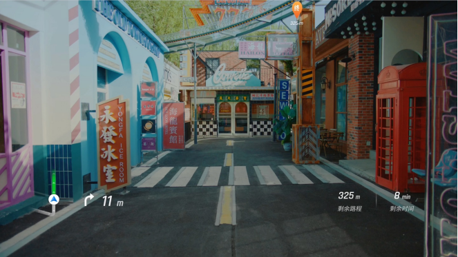 在导航过程中除了距离、路线、时间等基本信息之外,类似导航软件里到达目的地之后语音提示“目的地在您左/右侧”也被具象化。在你眼前虚拟屏幕的左/右侧,会有明确的“目的地这边”的方向提示。不仅如此,它的显示也主要集中在左侧、右侧、下方,而中间大部分区域、也就是我们的视觉中心区域则被空出来,方便看路。这也是我们能够放心佩戴A1在户外步行的重要原因之一。