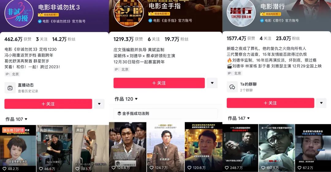 打开几部影片的官方抖音账号,按数据最好的一批短视频来看,“老”影片中,《非3》主要内容集中于发布会的切片、以及电影拍摄时留存的现场小花絮;《金手指》则是将重心全部押注在刘德华和梁朝伟身上,吃透影帝红利,要么是两人合拍的内容、要么是两人在正片中的交锋;而《潜行》则是以动作场面和演技反差场面为主。