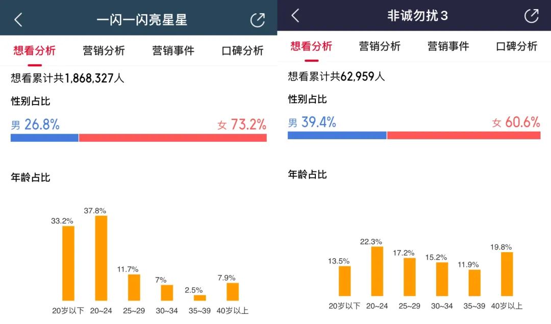有趣的是,今年的贺岁档混战有些“新”“老”交替的味道。从想看用户画像能看出来,贺岁档的几部影片受众很不一样。《一闪》主打年轻和女性观众,猫眼想看女性占比73.2%,24岁以下观众占比71%;而《非诚勿扰3》(以下简称《非3》)30岁以上观众占到了46.9%,其他影片则介于二者之间。