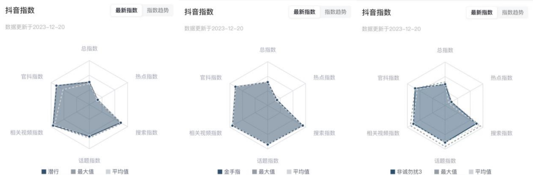 而在今年贺岁档“老”影片的短视频宣发中,暂时还完全看不到有序挖掘热门内容的迹象。几部影片的抖音指数六芒星图中,热点指数是明显的短板。