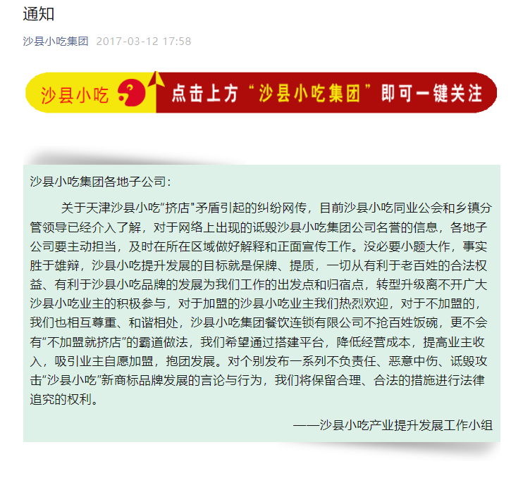 2017年,因为“挤店矛盾”,沙县小吃集团向各子集团下发过一则通知。通知中称,对于不加盟的,我们也相互尊重、和谐相处,沙县小吃集团餐饮连锁有限公司不抢百姓饭碗,更不会有“不加盟就挤店”的霸道做法。
