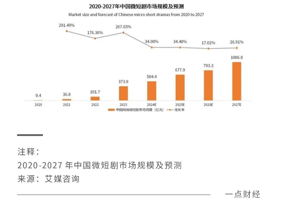 由此,微短剧吸引了各路资本进场,进一步推动了整个市场的增长。艾媒咨询《2023-2024年中国微短剧市场研究报告》显示,2023年中国网络微短剧市场规模为373.9亿元,同比增长267.65%,2027年中国网络微短剧市场规模将超1000亿元。