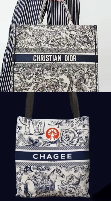 去年五周年之际,霸王茶姬以云南茶马古道为灵感,推出了全新包装设计。只是这样式多少有点眼熟。尤其是包袋款,从版式到插画风格都与DIOR的经典包如出一辙。