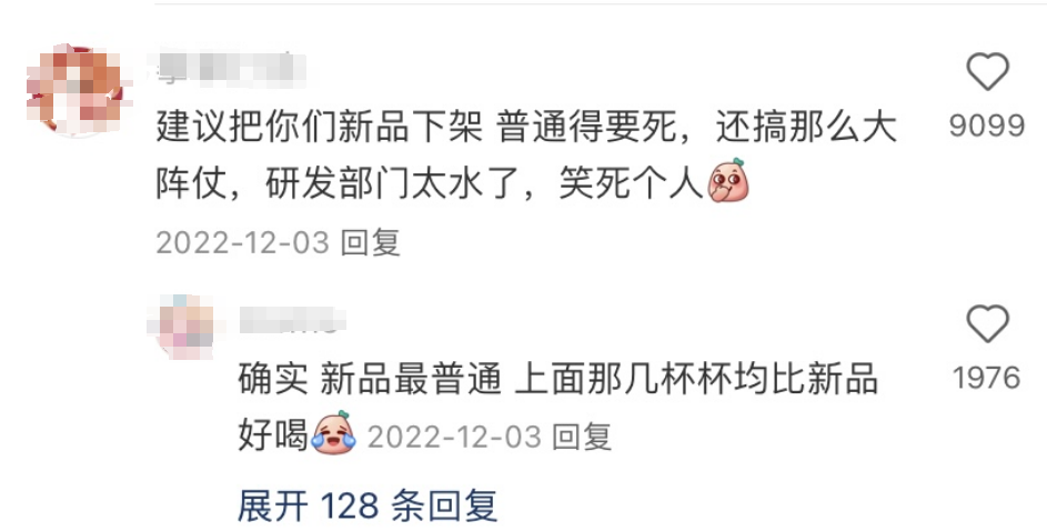伯牙绝弦已经累计卖出了一亿杯,是霸王茶姬当之无愧的明星单品。尽管霸王茶姬仍然在不断地推出新品,甚至为了控制单品量,时不时下架已有单品,给新品让位,但至今市场仍未看到下一款爆品的可能性。甚至在每一次上新的评论区里都能看到大量粉丝在吐槽新品难喝。