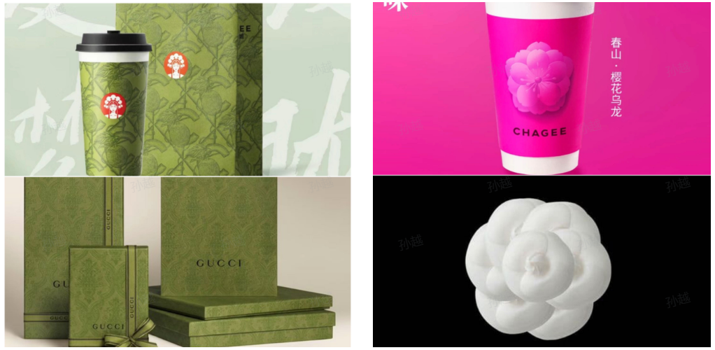 霸王茶姬没有停下与大牌“撞脸”的脚步,今年又继续推出了好几款新包装,不仔细看的话,很难分辨出它们与CHANEL的山茶花元素、Gucci的配色风格、LV的花纹之间有什么区别。