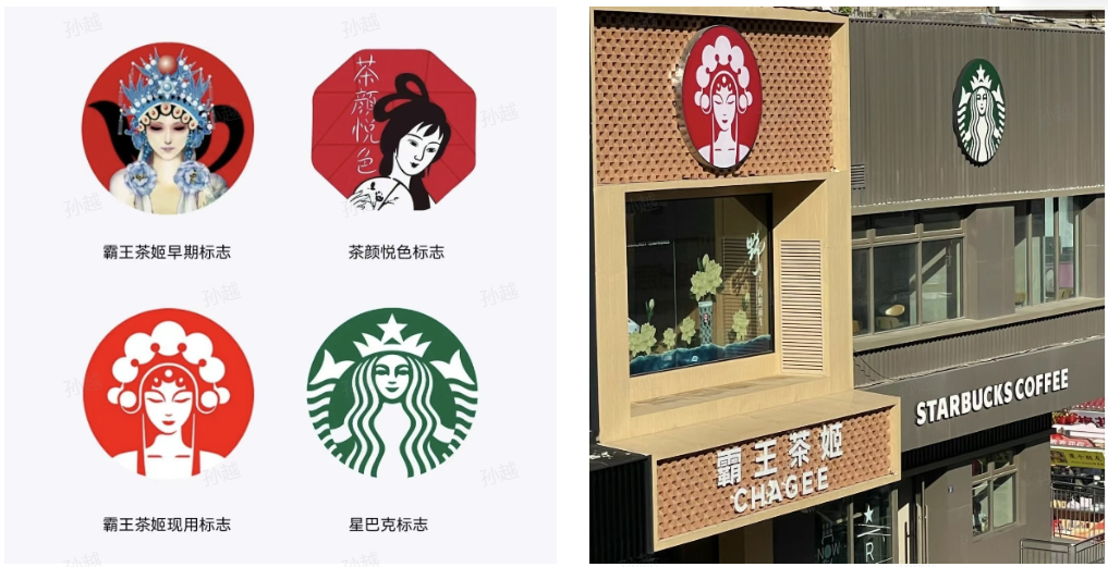 品牌调性上,霸王茶姬与茶颜悦色“不谋而合”的都使用了新中式风格。品牌logo、产品名称以及门店设计上,霸王茶姬也是亦步亦趋。品牌升级后,霸王茶姬换用了“简单配色+强视觉冲击力”模式的logo,与星巴克“殊途同归”。