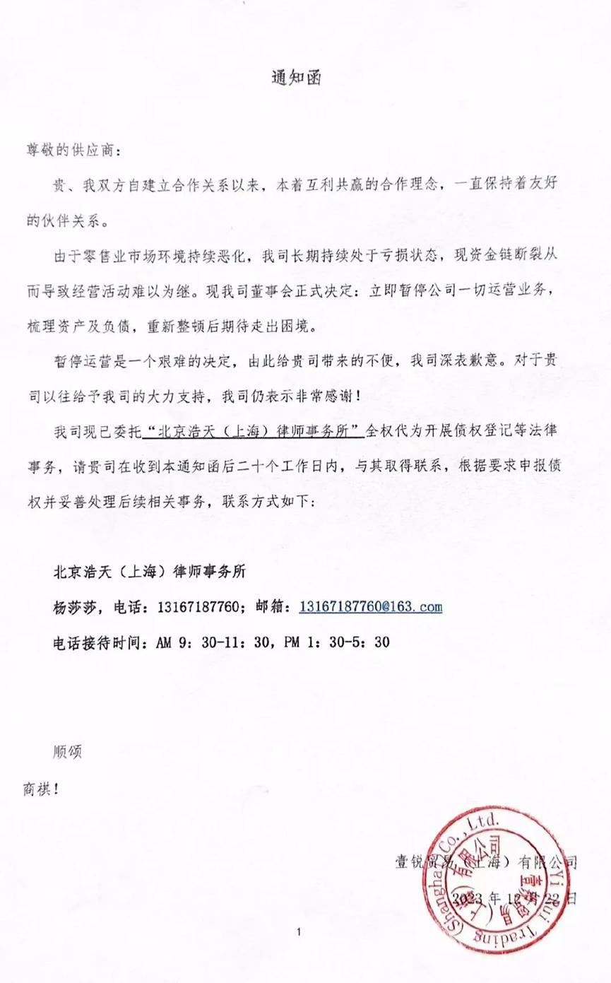一份供应商《通知函》里,比宜德运营公司壹锐贸易(上海)有限公司表达的停业原因是:零售环境持续恶化,长期亏损,资金链断裂,导致经营活动难以为继。