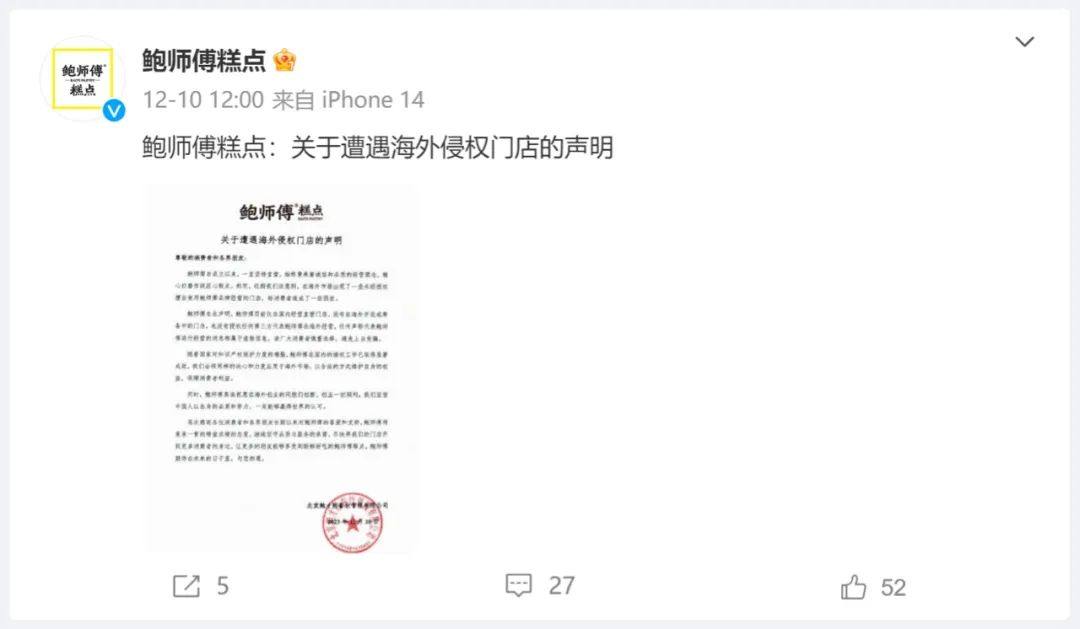 同样的案例还有很多,12月11日,#鲍师傅回应海外门店侵权的微博话题也登上热搜。