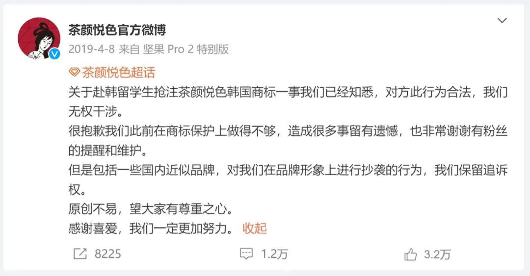 对此,茶颜悦色也在微博上正式回应称:对方此行为合法,我们无权干涉。但是并没有出钱回收该韩国留学生的注册商标。