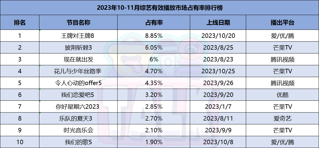 从播放占比来看,前十名除了《现在就出发》,其余节目也都是老牌综N代。《王牌对王牌8》《披荆斩棘3》延续热度,成功抢占市场份额。《花儿与少年丝路季》《令人心动的offer5》紧随其后热度不减。
