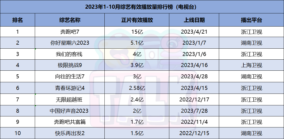 在台综方面,前三季度有效播放量前十名的节目里有八档都是综N代。其中浙江卫视播出的《奔跑吧7》以15亿播放量占据榜首,《你好星期六2023》《极限挑战9》《向往的生活7》等老牌综艺节目也都榜上有名。