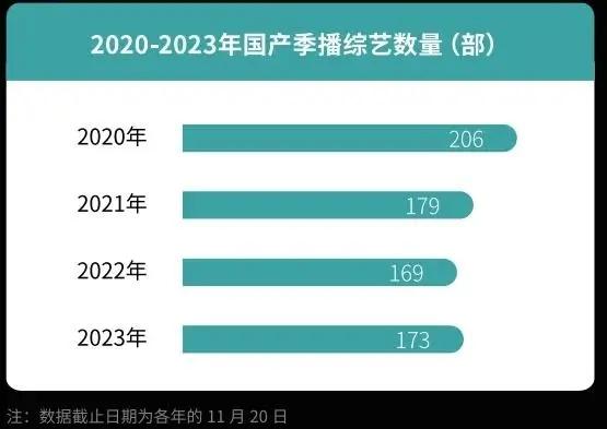 今年国产季播综艺数量是173档,仅比2022年增长4档,在数量上可谓停滞不前。