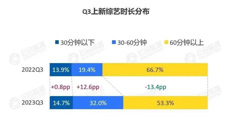 云合数据《2023年Q3综艺网播表现及用户分析报告》显示,2023年Q3集均时长60分钟以下的季播综艺共上新35部,同比增长11部。