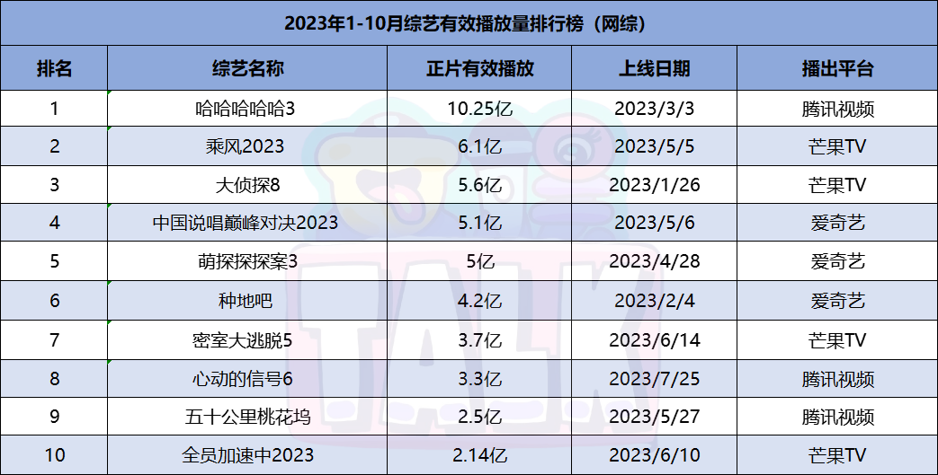 《哈哈哈哈哈3》以10.25亿播放量居首位,《乘风2023》《大侦探8》《中国说唱巅峰对决2023》《萌探探探案3》播放量也都超过5亿。