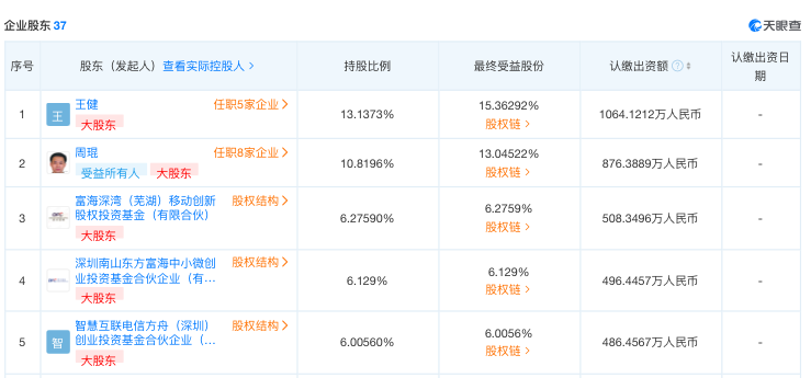 管理层方面,联合创始人王健持股约13.14%(最终受益股份约15.36%);周琨持股约10.82%(最终受益股份约13.05%)。