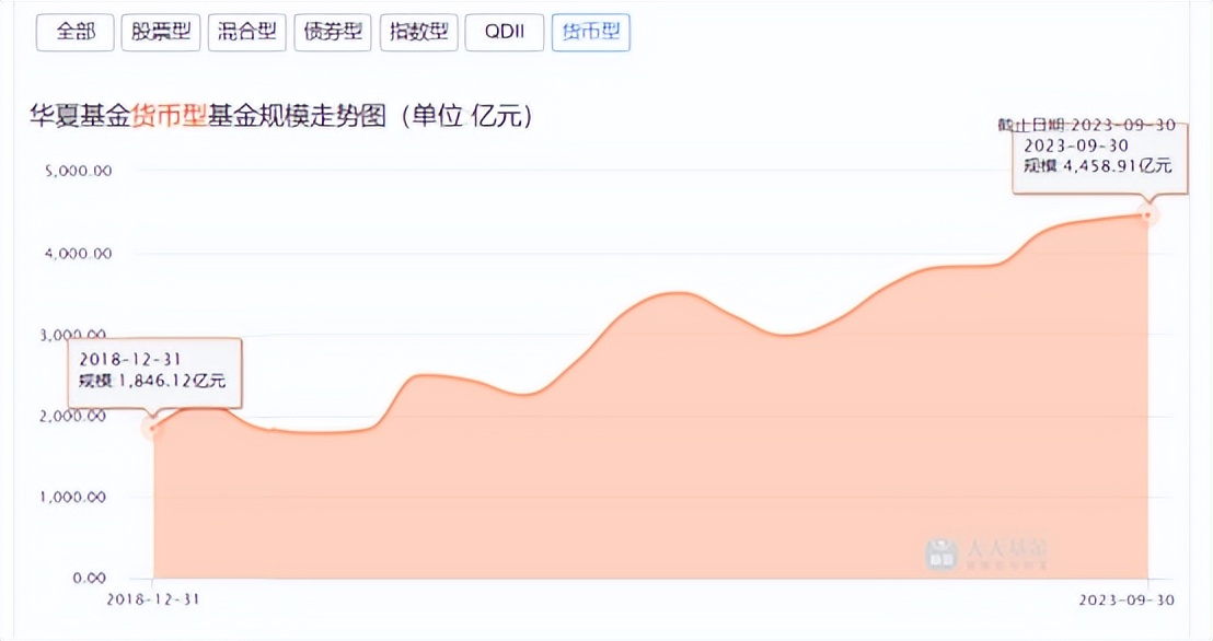 2018年底时,华夏基金的资管规模仅4297亿,5年间,增长了189%。显然,这段时间,正是公募基金规模大扩张的几年。其中,货币基金从当时的1846亿,增长到当下的4458亿,增长了142%。