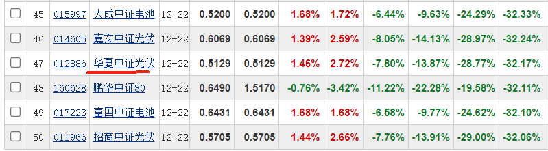 不过,在指数型基金业绩负增长排名中,截至2023年12月22日,华夏中证光伏产业指数发起式C位于第47位,业绩近1年下滑32.17%。光伏等新能源概念股属于2023年A股的重灾区,华夏基金这只光伏产业指数基金业绩如此,不足为奇。