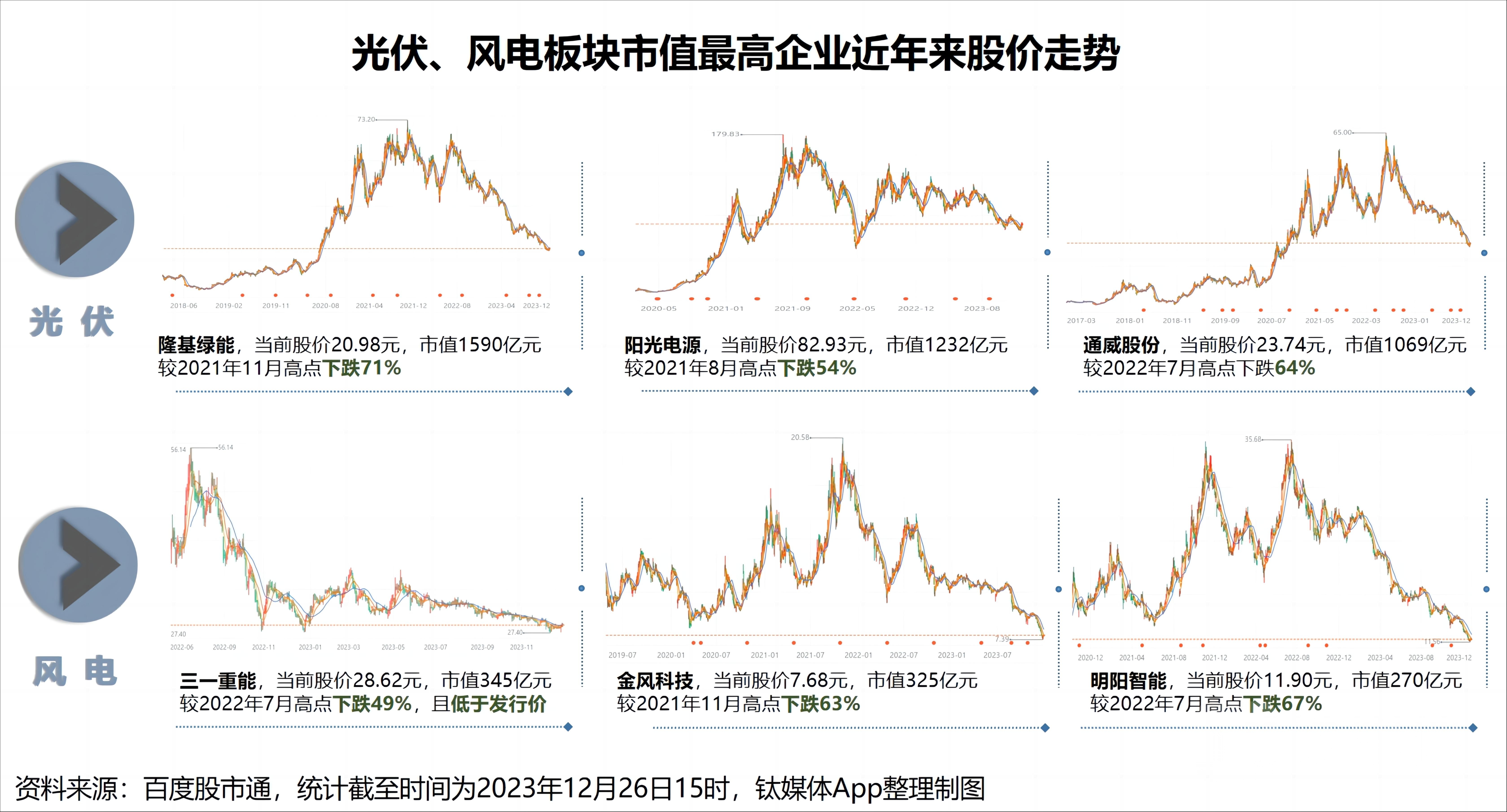 光伏方面,硅料结束去年的“疯涨”,转身陷入“狂跌”,根据中国有色金属工业协会硅业分会的统计,年初2月份致密料、复投料等各类硅料价格均接近25万元/吨,但到了12月份,价格均在8万元/吨以下运行,单晶致密料成交价甚至跌至6万元/吨以下,年内跌幅超70%;硅片方面,M10硅片年初3月份最高周均价一度达到6.37元/片,12月最新公布周均价跌至1.92元/片,跌幅近70%;G12硅片3月份最高周均价达到8.2元/片,12月最新公布周均价跌至3.02元/片,跌幅超50%;电池片、组件价格走势相近,目前价格较年初均几乎打了五折,以组件为例,年初价格在1.9元/瓦左右,10月份单瓦投标价、开标价相继跌穿1元,成为标志性事件,此后竞标企业“价格战”愈发激烈,根据光伏行业协会的统计,11月至12月期间,组件中标价已整体低于1元/瓦,12月下旬虽略有回升,但较年初已然接近腰斩。
