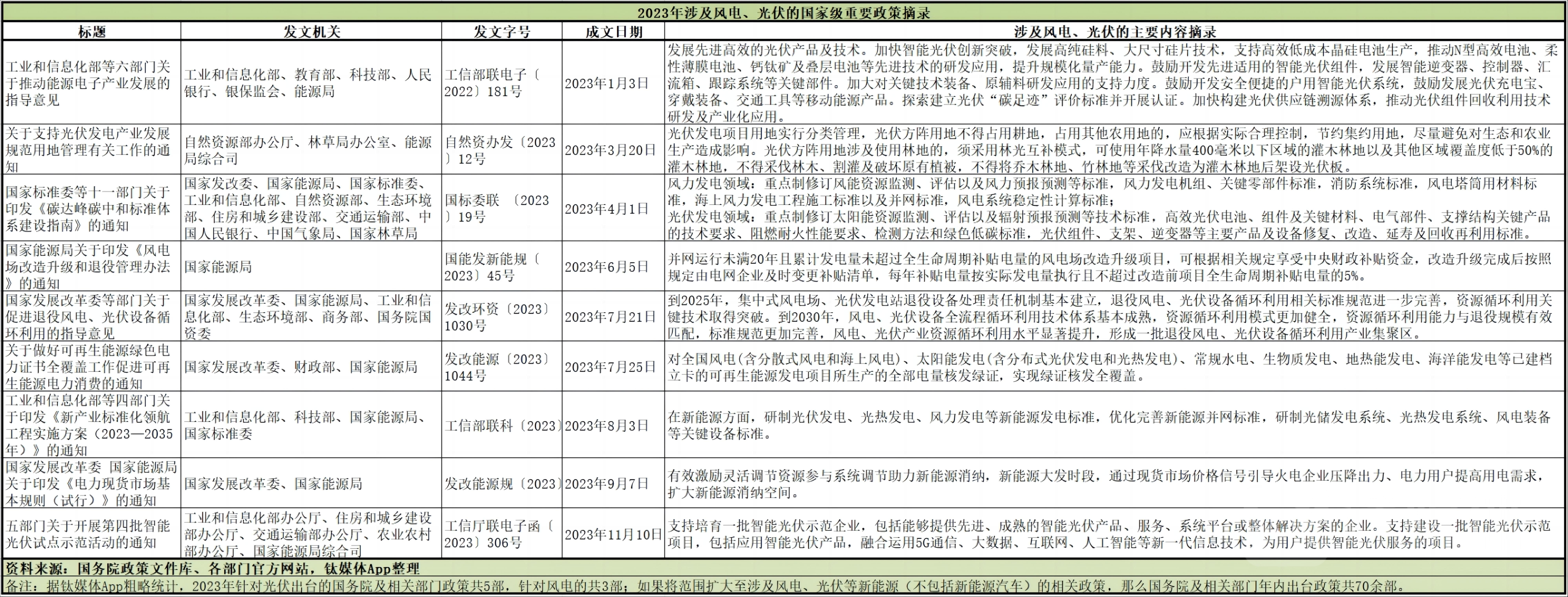 (1)路线图基本绘就的情况下,标准、规范的设计制定愈发受到重视。相比于前两年集中出台的各类规划、行动方案,2023年国务院及所属部门发布的相关政策明显变少,年内仅出台了工信部主文的《新产业标准化领航工程实施方案(2023—2035年)》和能源局主文的《加快油气勘探开发与新能源融合发展行动方案(2023-2025年)》,均为聚焦细分或交叉领域的具体落实方案。地方层面,广东、四川等地相继发布碳达峰实施方案,上海、重庆等地也陆续出台交通、工业等领域碳达峰实施方案或行动计划,从中央到地方的政策路线图、规划方案已基本完备。同时,新的政策引导方向开始向标准设计、规范制定方面延伸,较有代表性的文件包括《碳达峰碳中和标准体系建设指南》、《光伏发电工程验收规范》、《风电场改造升级和退役管理办法》以及一系列有关电力市场的规范、意见。此外,值得注意的是,以风电、光伏为代表的新能源新兴产业的政策框架基本搭建完毕,而以新型储能、氢能为代表的未来产业规划正加速出台,相关产业政策红利也逐步释放;