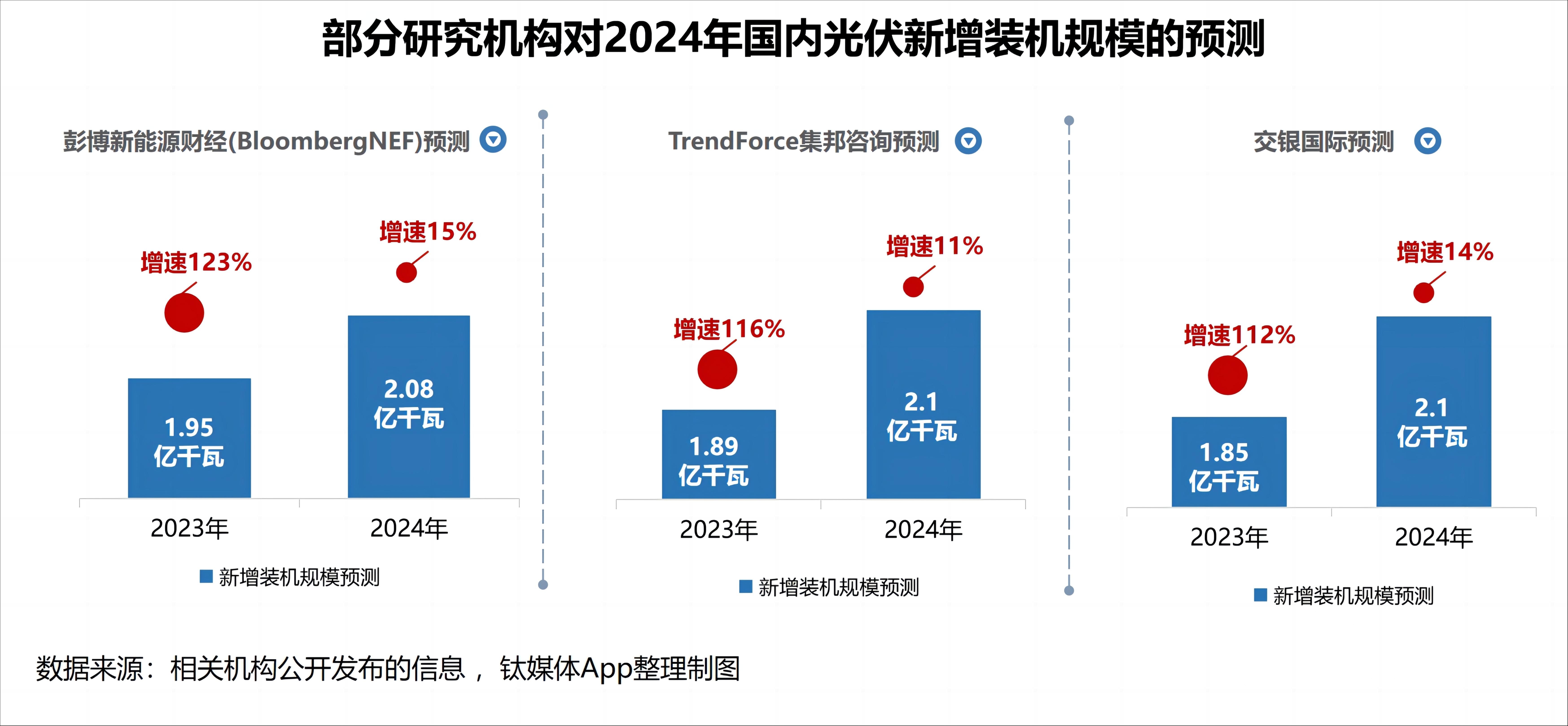 2023年,光伏、风电中上游设备制造环节面临着如前文所述的产能过剩、价格战等问题,但这其实也就意味着下游电站能够得到更宽松的供应,付出更低的成本,华能国际等发电巨头年内风电、光伏业务发展势头良好,盈利大增,再加之煤价下降等因素影响,五大发电集团半年报均实现扭亏为盈。中国电建、中国能建等能源建设企业也在新能源领域找到了越来越多的业绩增量。但同时,为保供、调峰需要,新的煤电机组审批也在年内大幅回暖,煤电容量电价等支持政策也终于出台。2024年,随着利好传统能源的政策发挥效应,风电、光伏的需求增长速度恐将受到冲击,以光伏为例,在彭博新能源、集邦咨询等机构的预测中,2024年我国光伏需求增速将大幅放缓。而从全球来看,对明年全球光伏装机增速的预测普遍未超过30%(今年预计会超过60%)。如果上游过剩的产能无法妥善安置,那么供需问题恐将进一步加剧,届时影响的会是整个产业链甚至新能源发展、新型电力系统的建设。