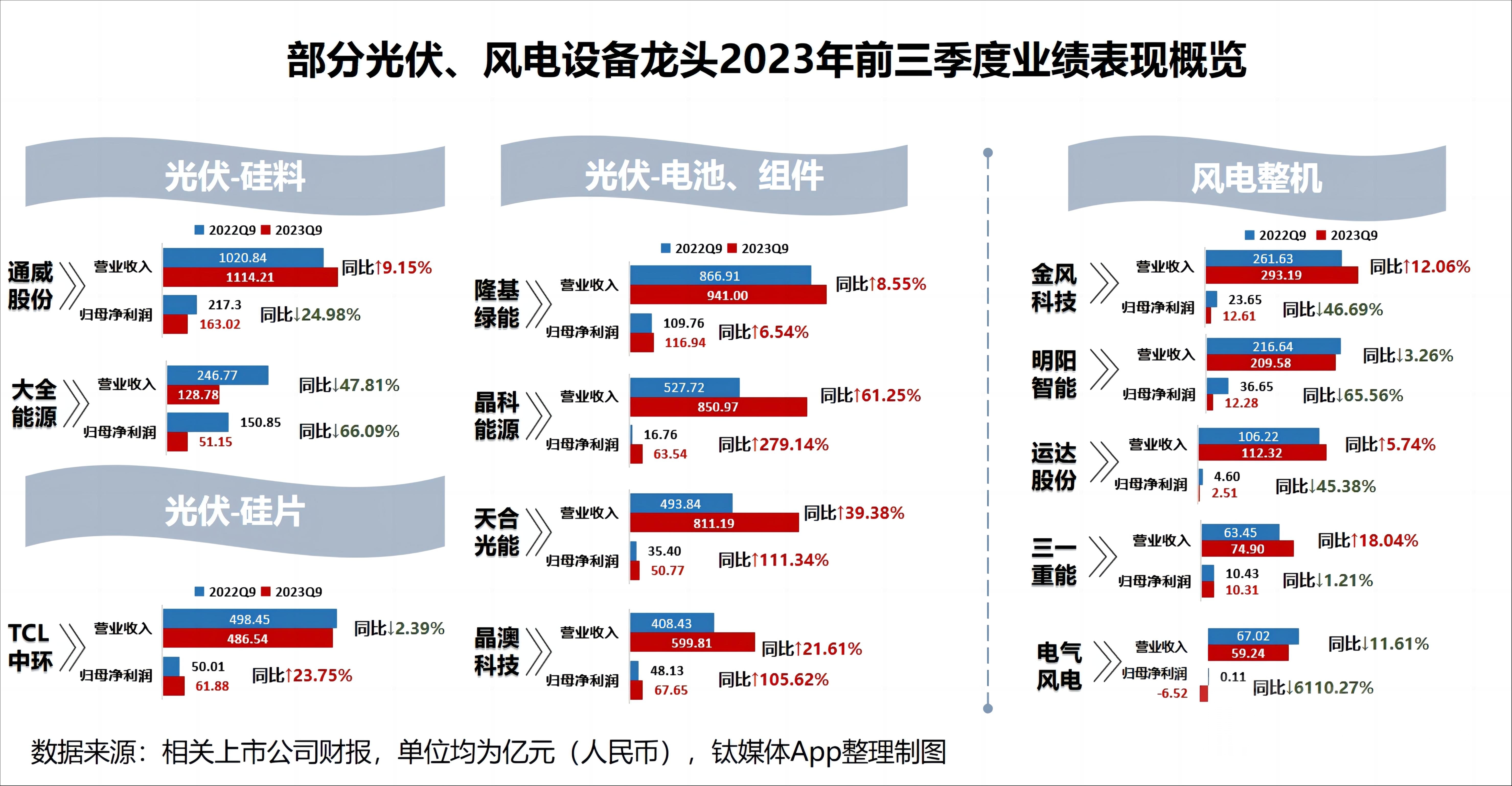 作为率先走通商业化的新能源产业,风电、光伏企业,尤其是其中的龙头公司,近几年多处于业绩高速增长期。但到了2023年,由于此前所述的产能过剩、价格战、出海受阻等种种原因,不少企业面临着营收、净利增长失速的压力。