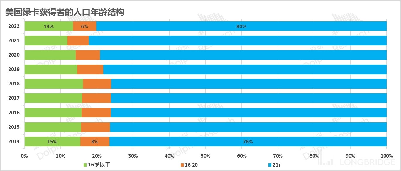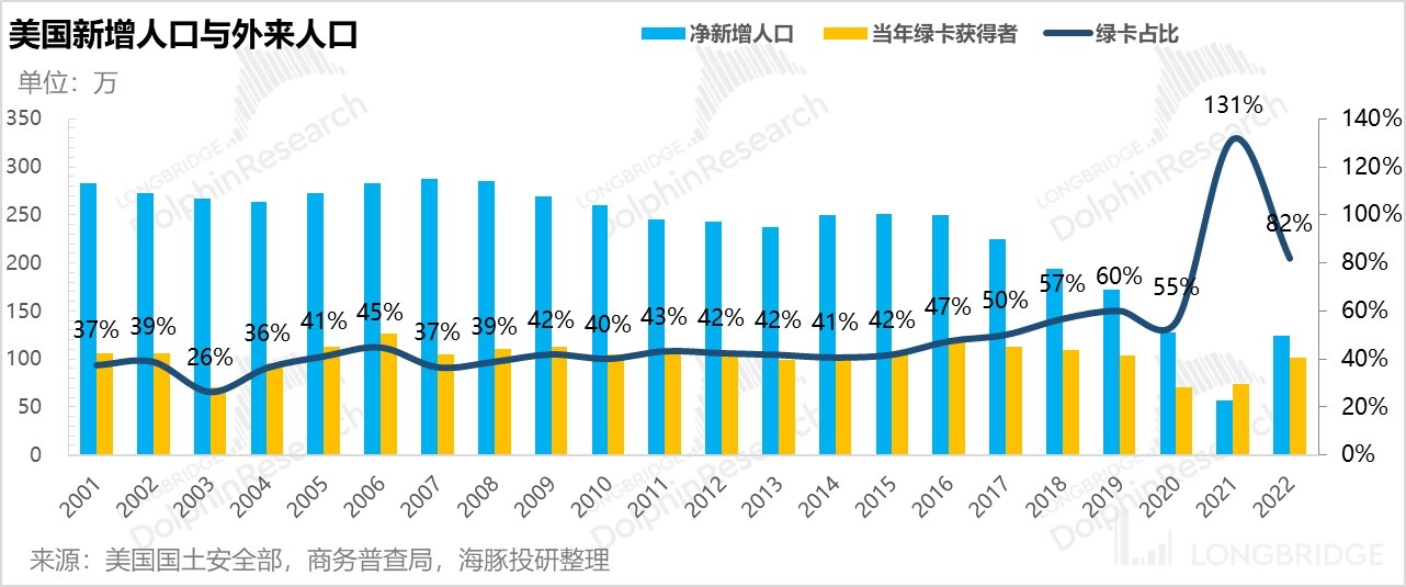 a) 过去二十年,每年美国获得绿卡的人数对美国净新增人口的贡献比例一路从 35% 拉到了疫情前的 66%,2022 年更是到了净新增人口的 80%,可以说美国目前的人口增长,新生完全无法弥补死亡,人口总量的维稳和微增,全靠移民。