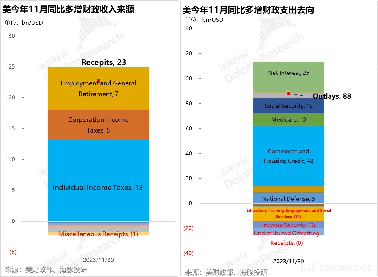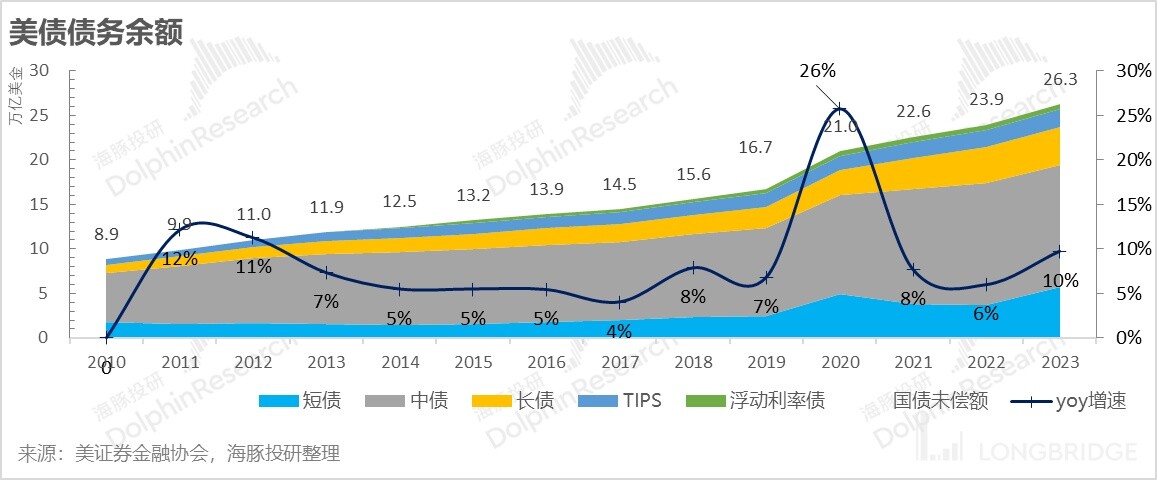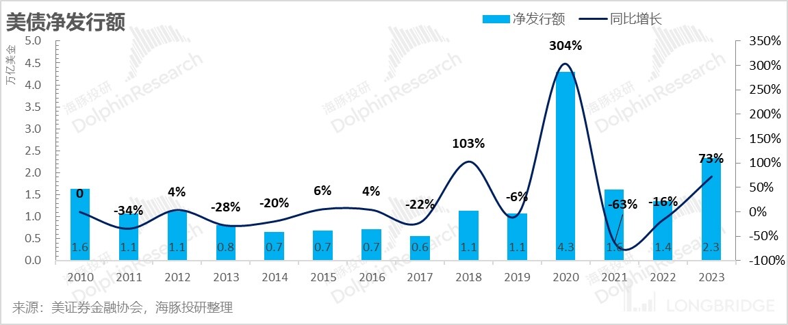 d) 只有政府还在生猛加杠杆:2023 年企业和居民加杠杆的行为都减弱了很多,高息之下,只有联邦政府还在生猛加杠杆:债务余额增速不仅基数最高,而且增速也最高;净发行的债务金额更是创下疫后新高。