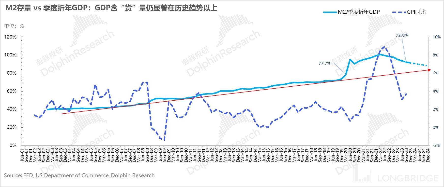 美国在疫情时候,发了太多的货币,导致到现在美国经济的含币量仍然在历史趋势值之上。如果按照历史趋势,如果按照当前真实经济增长节奏和量缩节奏,要挤光美国经济的超额货币量,恐怕量化紧缩还要再持续一年。