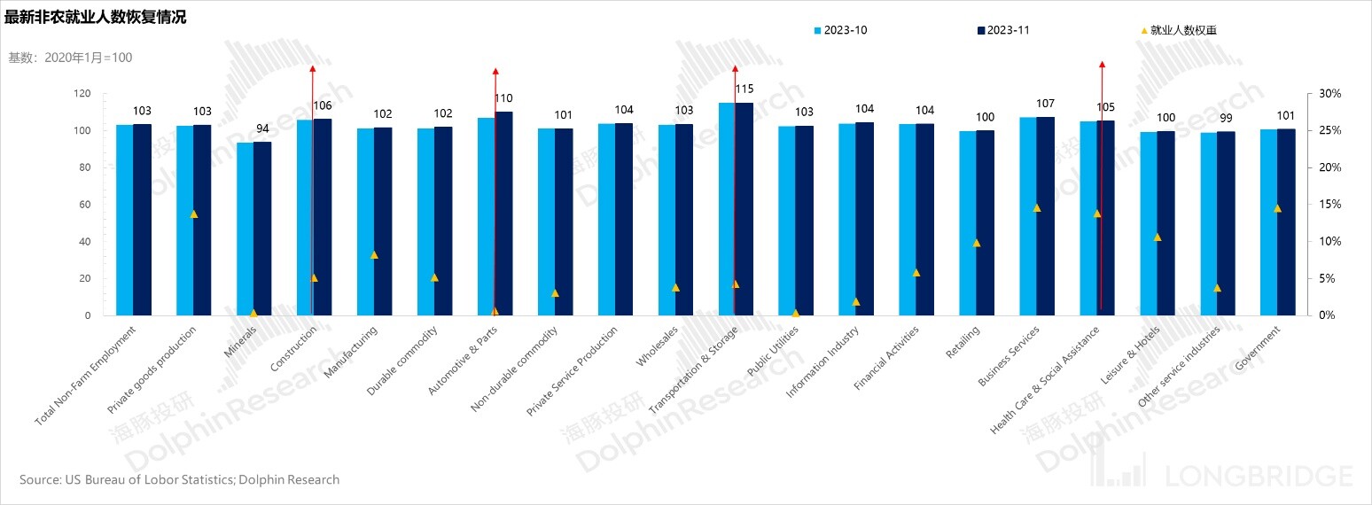 而这三大法案,也是美国再高息之下,制造业中的汽车和零部件产业就业恢复仍然能够远超 2020 年,制造业整体去库存之际,制造业上游(建产能)的建筑业仍然能够就业、招工旺盛的原因。